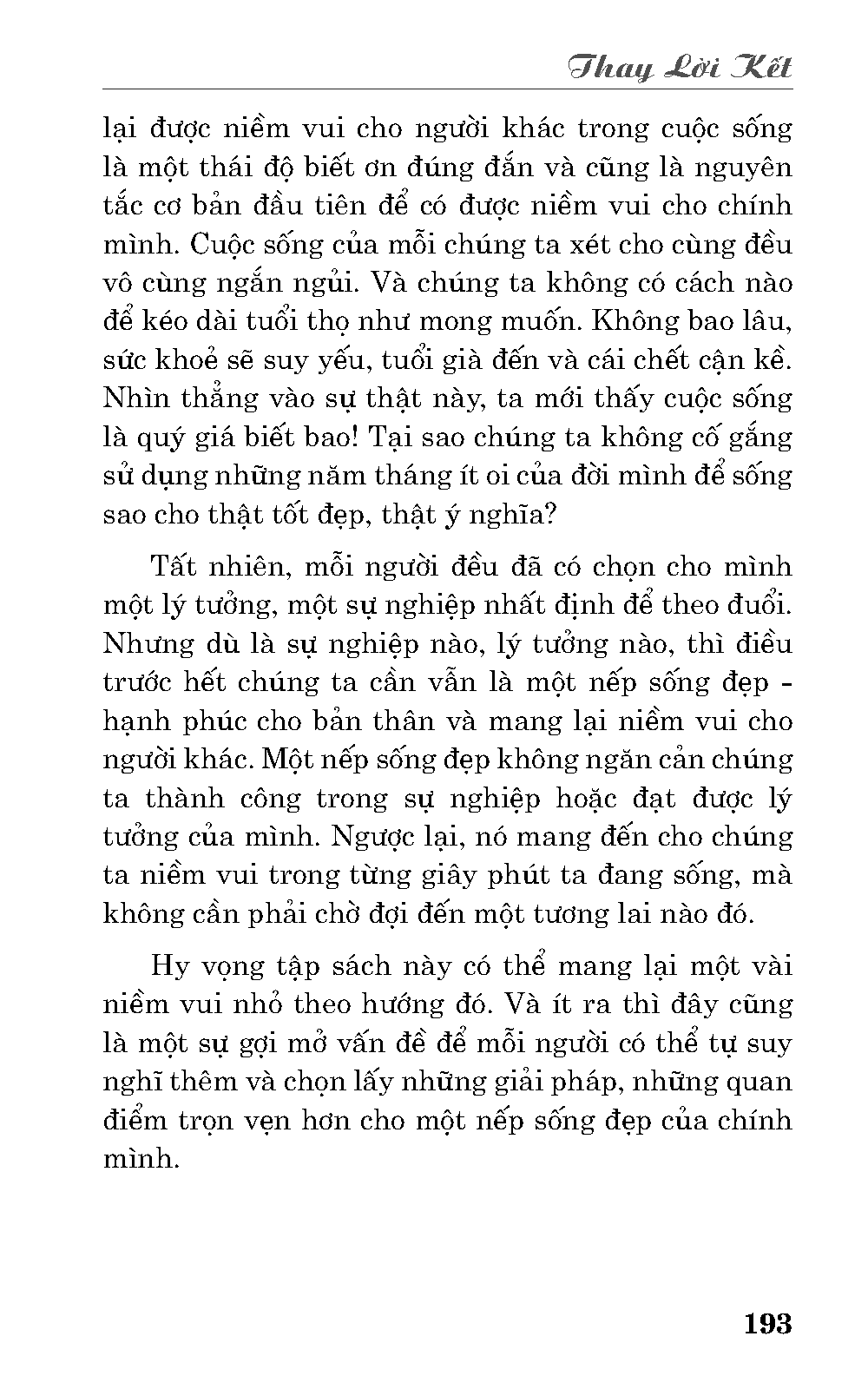 Con người sinh ra trần trụi và chết đi cũng không mang theo được gì. Tất cả những giá trị chân thật mà chúng ta có thể có được luôn nằm ngay trong cách mà chúng ta sử dụng thời gian của đời mình.Tủ sách Rộng Mở Tâm Hồn